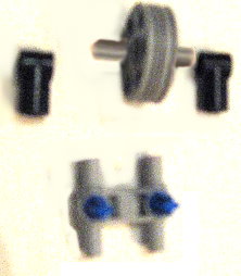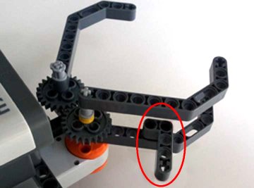 Exercise 2: In this exercise we will be setting limits on opening and closing the claw. It can be difficult to open the claw just the right amount to grab something, so we're going write a program that will fully open the claw, no matter how opened or closed it is when it starts out, and then stop Motor "A" just when the claw is fully open. Before we write our program, we're going to attach a bar to the motorized part of the claw, that will stop the claw from opening too wide. Add the piece circled in the picture below to your claw: