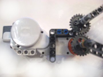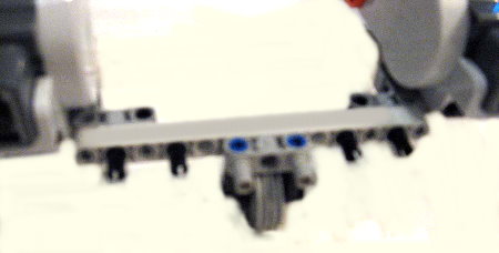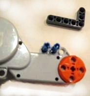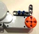 Notice that this "stopper" piece will hit the robot if the claw tries to open too far. Now we need to figure out how to get motor "A" to open the claw until the extra piece we added hits the robot, and then stop Motor "A" from running . We'll use the rotation sensor to do this. The trick we will use is to run motor "A", and keep checking the rotation sensor, which tells us how much motor "A" has moved. When the value from the rotation sensor stops changing, that means that motor "A" has stopped turning, because our stopper piece has hit something.