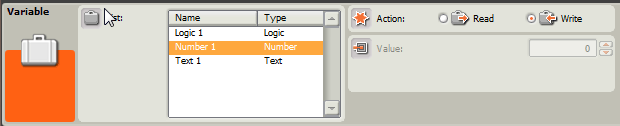 - Now we'll do something new. We're going to store the reading from the rotation sensor in a variable, called "Number 1". To do this, add a Variable block (from the Data menu). Make the data type of the variable a number (select the option called "Number 1"), and specify that we will be writing a value to the variable. Then copy the reading from the rotation sensor to the variable using a data wire as seen in the picture below.