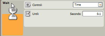 Now we're going to wait a short while before checking the rotation sensor again to see if motor "A" has moved at all. Remember, if motor "A" has moved at all, then the claw is still opening. Add a Wait block (from the Common menu), and set the wait time to 0.1 seconds.
