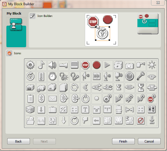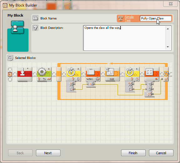 You will see a page called the "Icon Builder". This lets you create a picture for the front of your "Fully Open Claw" block, so that you can distinguish it from other blocks. Drag, drop and resize different icons to create a unique picture for the front of your block. Click "Finish" when done.